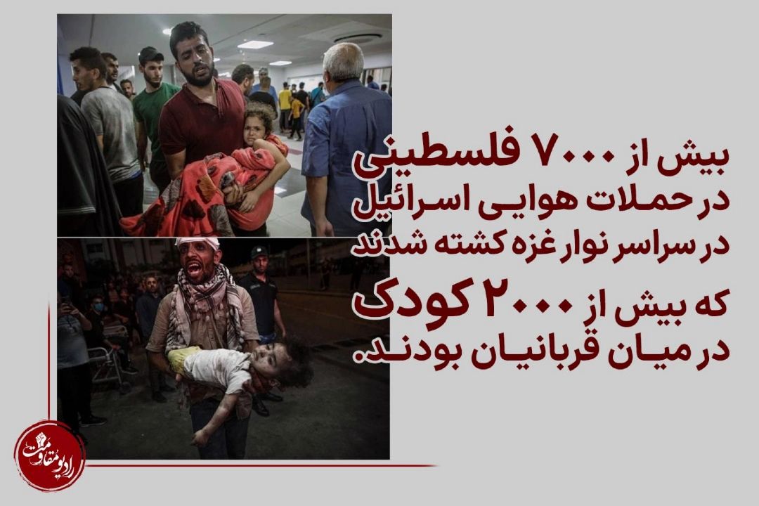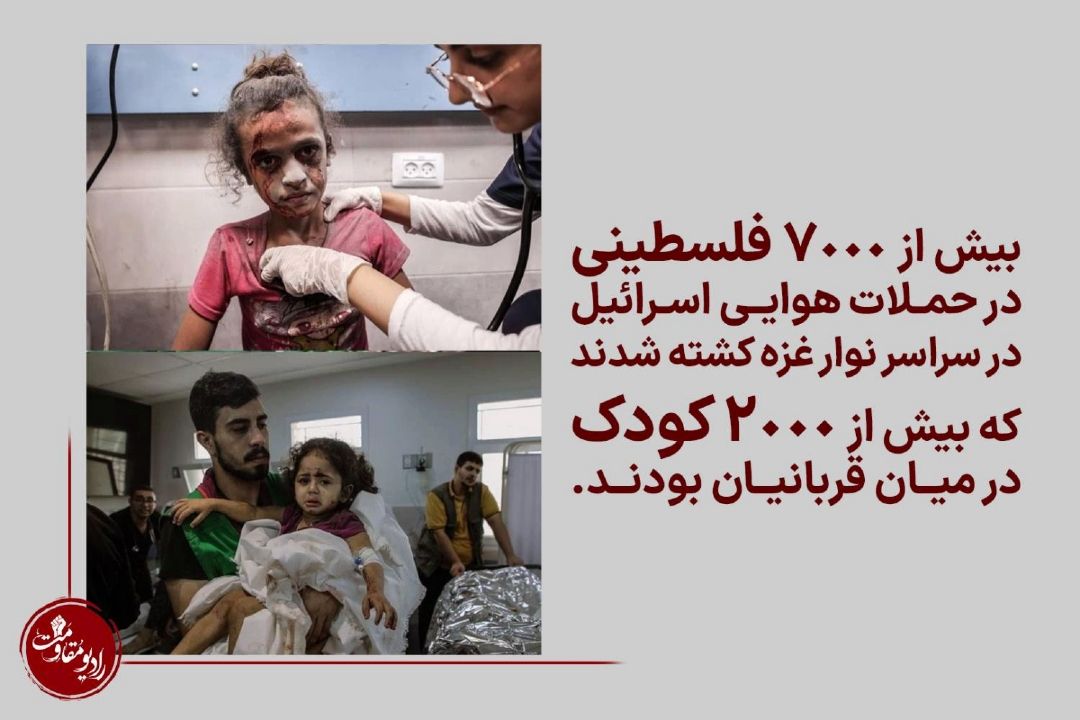 از 7 اكتبر تاكنون حداقل 4324 كودك در بمباران اسرائیل كشته شده اند. براساس آمار ارائه شده ارتش اسرائیل طی ماه گذشته دو برابر تعداد كل كودكان فلسطینی كشته شده در كرانه باختری و غزه اشغالی از سال 1967 در نوار غزه، كودك كشته است. علاوه بر این تعداد كودكان كشته شده در غزه، حدود 1350 كودك زیر آوارها مفقود شده اند كه به احتمال زیاد اكثر آنها مرده هستند. آنتونیو گوترش، دبیركل سازمان ملل متحد گفت غزه در حال تبدیل شدن به "قبرستان كودكان" است.